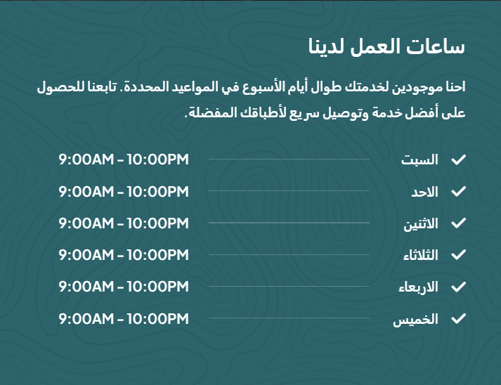 احنا موجودين لخدمتك طوال أيام الأسبوع في المواعيد المحددة. تابعنا للحصول على أفضل خدمة وتوصيل سريع لأطباقك المفضلة.