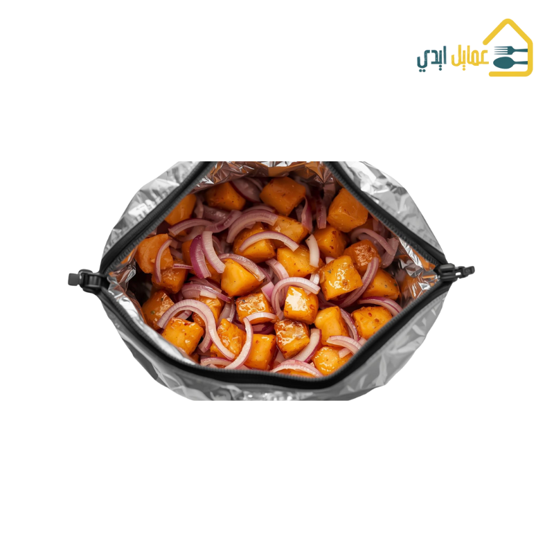 قطع من مكعبات صدور أو وراك الفراخ المخليه مع البصل والتوابل داخل كيس حراري جاهزه علي التسويه في الفرن